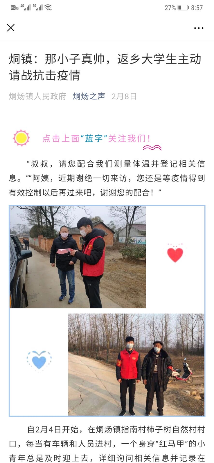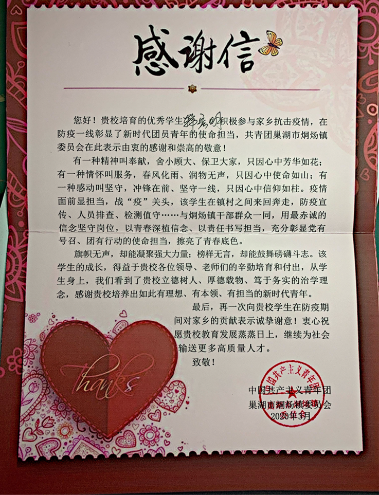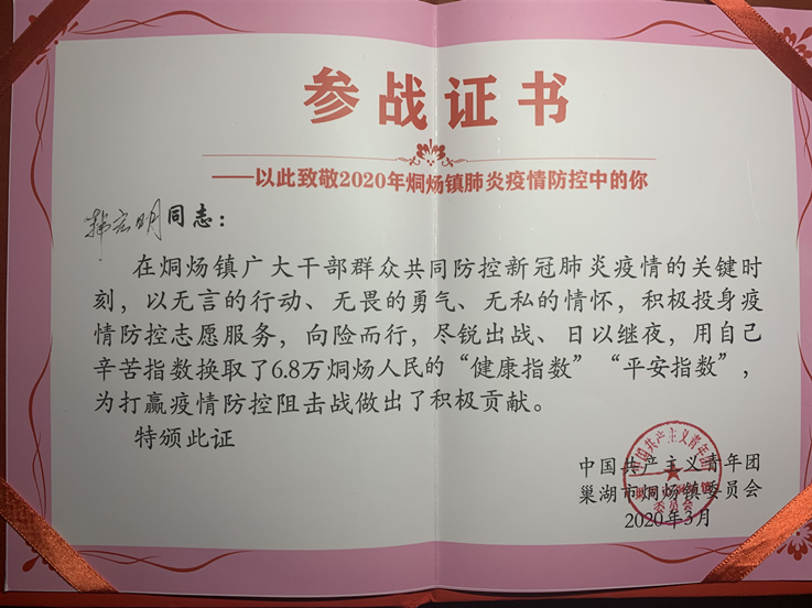 对英雄的敬仰和家乡的感情,是韩宏明请求成为志愿者的最初原因。随着越来越多的志愿者参与到这场没有硝烟的战争中,疫情很快得到控制,烔炀镇政府也为他颁发了荣誉证书,对他及培养他的母校表示感谢。烔炀镇政府也在媒体上宣传了他的事迹!(作者:胡明亮;审核:汪翼湧)