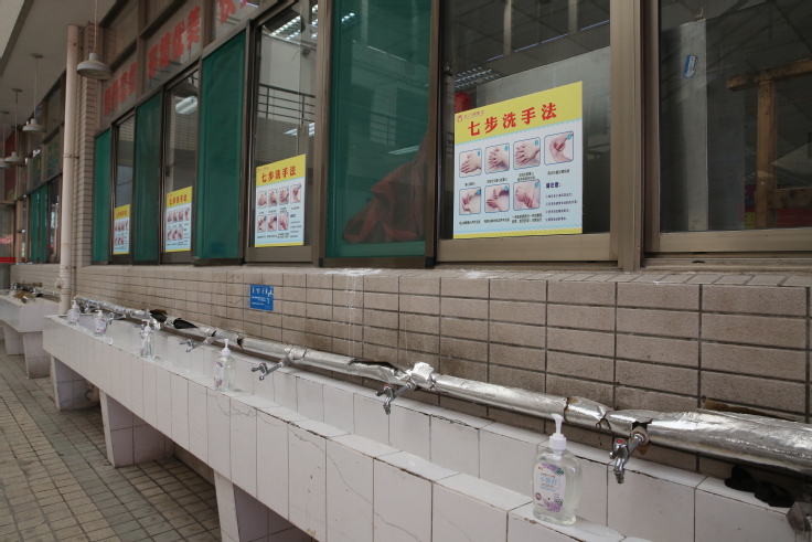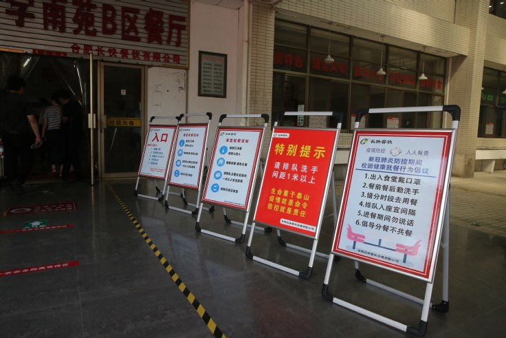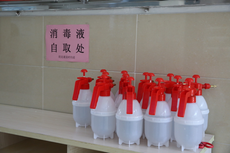 在宿舍、食堂等学生生活区,用于定时消杀的消毒液等防疫、生活物资储备充足,摆放到位。