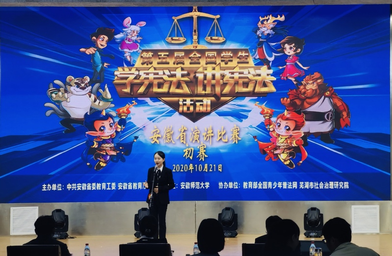 本网讯 10月19日和10月21日,第五届全国学生“学宪法 讲宪法”安徽省知识竞赛和演讲比赛在安徽师范大学举办,我校18级法学陈纪鞍和19级法学牛丽群成功入围复赛并分获一等奖和三等奖。