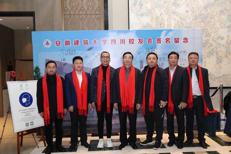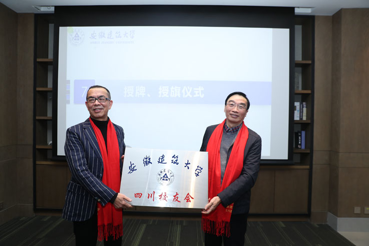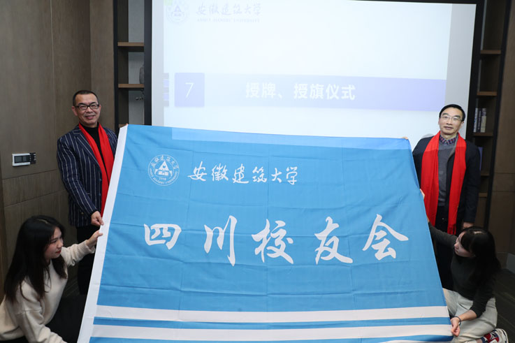 孙道胜向四川校友会授“安徽建筑大学四川校友会会牌、会旗”。