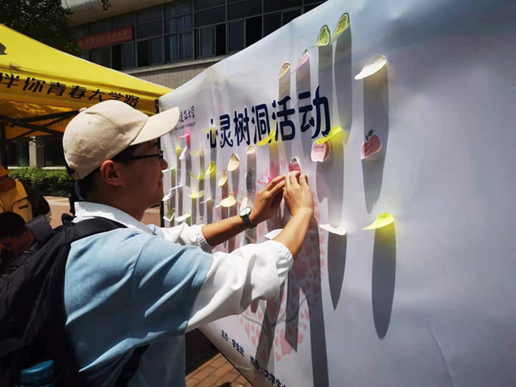 本网讯 为了丰富学生课余文化生活,促进学生身心健康发展,由学生处心理健康中心主办、大学生心理协会承办的第十七届心理健康教育月活动之“倾诉心声 美丽心情”心灵树洞近期在南区北食堂广场举行。