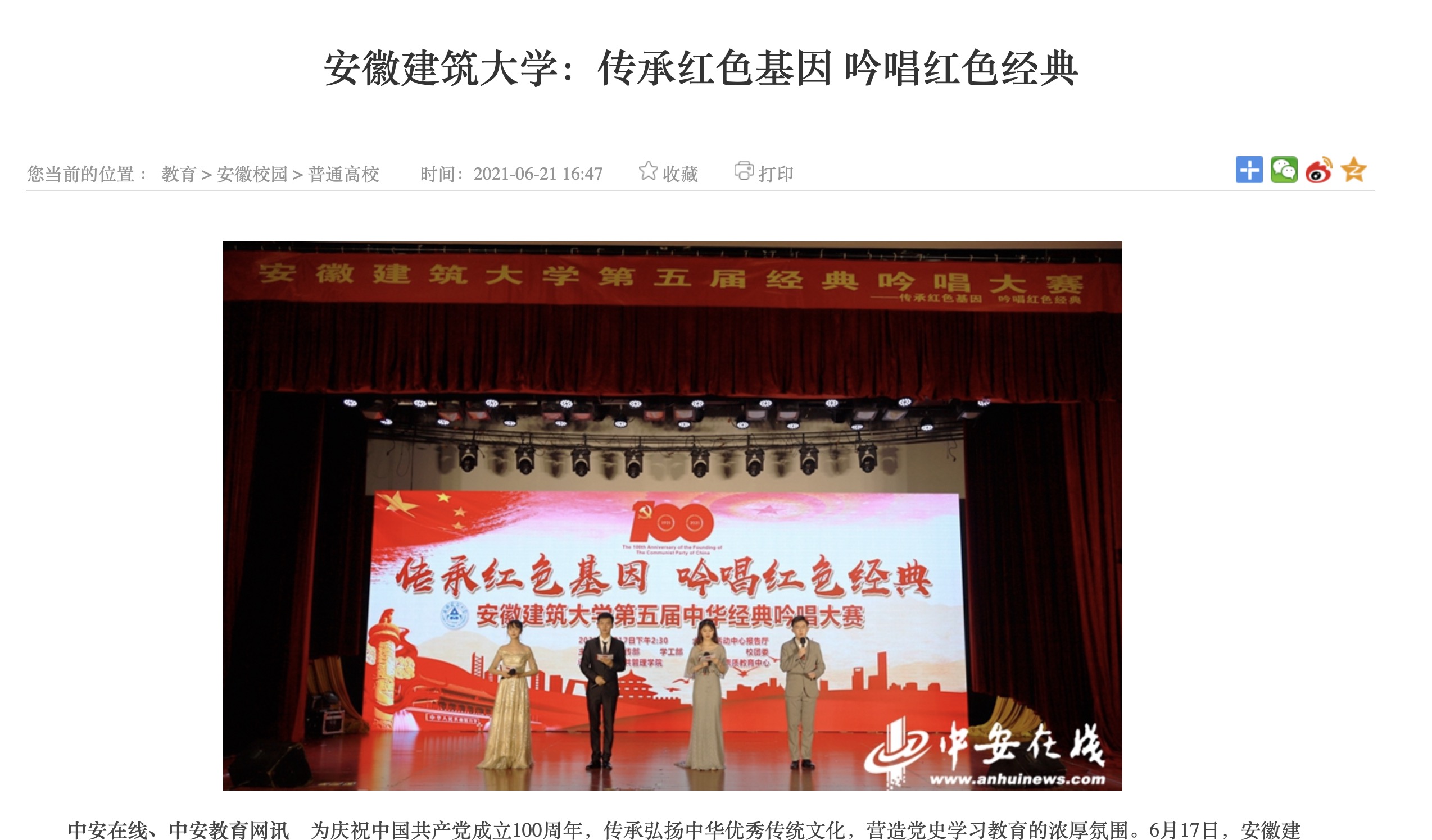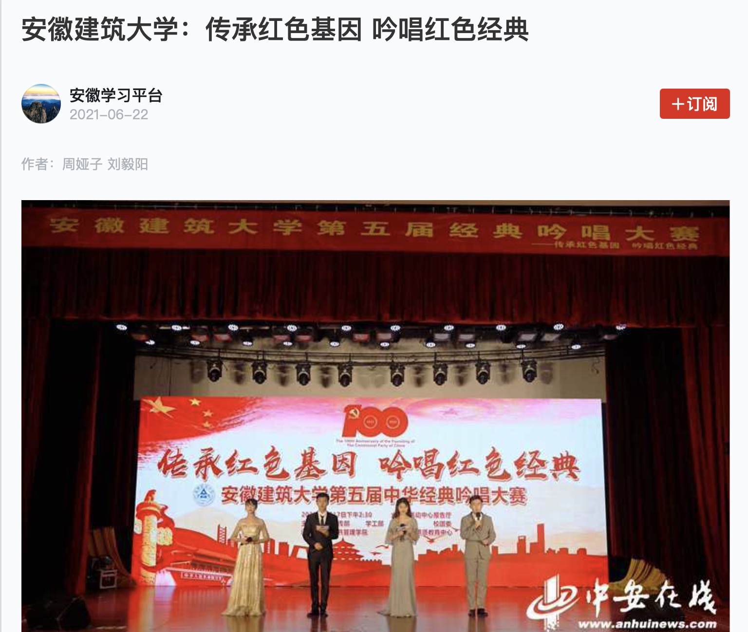 编者按:为庆祝中国共产党成立100周年,传承弘扬中华优秀传统文化,营造党史学习教育的浓厚氛围,6月17日,我校举办了“传承红色基因,吟唱红色经典”第五届中华经典吟唱大赛,6月21日,中安在线对此进行了报道,6月22日,学习强国平台进行了转载推介。