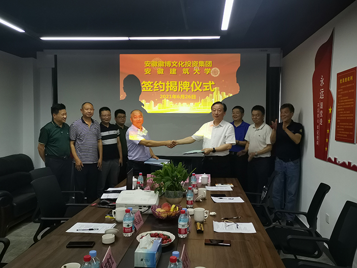 本网讯 6月26日,副校长蔡新立率队赴安徽徽博文化投资有限公司签订校企产学研战略合作协议,并为安徽建筑大学和安徽徽博文化投资有限公司产学研合作基地、科技成果孵化基地揭牌。科学技术处、科技成果转化中心、徽派建筑安徽省重点实验室相关人员参加签约和揭牌仪式。