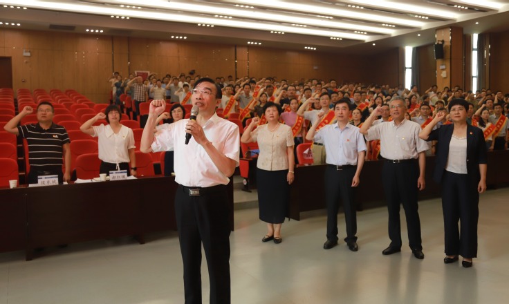 大会在雄壮的《国歌》声中拉开序幕,校党委书记、校长孙道胜带领全体党员重温入党誓词。