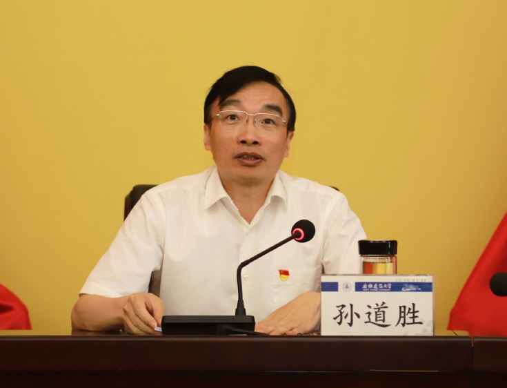 孙道胜在会上作题为《学习百年党史 汲取奋进力量》的专题党课报告,从开天辟地的救国伟业、改天换地的立国伟业、翻天覆地的富国伟业、惊天动地的强国伟业等四个方面介绍了中国共产党百年开创的历史伟业,带领中华民族和中国人民实现了站起来、富起来和强起来的历史性飞跃。孙道胜强调,回首百年党史,要把党史当做最好的营养剂,从红船精神、长征精神、延安精神、雷锋精神等伟大精神谱系中汲取养分,坚定理想信念,为共产主义事业奋斗终身。全党开展党史学习教育以来,学校认真贯彻落实党中央、省委决策部署,坚持学史明理、学史增信、学史崇德、学史力行相结合,坚持学党史、悟思想、办实事、开新局相一致,不断推进党史学习教育走深走实。孙道胜要求,要全面加强党的政治建设,认真落实意识形态工作责任制,深化师生思想政治工作,持续加强组织建设,扎实做好选人用人和干部教育管理工作,持续抓好党风廉政建设,巩固巡视整改工作成果,坚决维护校园安全稳定,进一步纵深推进学校全面从严治党,不断提升党建工作质量。孙道胜最后强调,中国共产党立志于中华民族千秋伟业,百年恰是风华正茂,我们要以习近平新时代中国特色社会主义思想为指导,全面贯彻落实党的十九大和十九届二中、三中、四中、五中全会精神,从党的百年奋斗历程中汲取继续前进的智慧和力量,以召开学校第二次党代会为契机,谋篇布局、抢抓机遇,扎实做好学校“十四五”开局之年工作,站在新的历史起点上,团结一致,同心同德,扎实工作,为建设国内一流、特色鲜明的高水平建筑大学而努力奋斗!