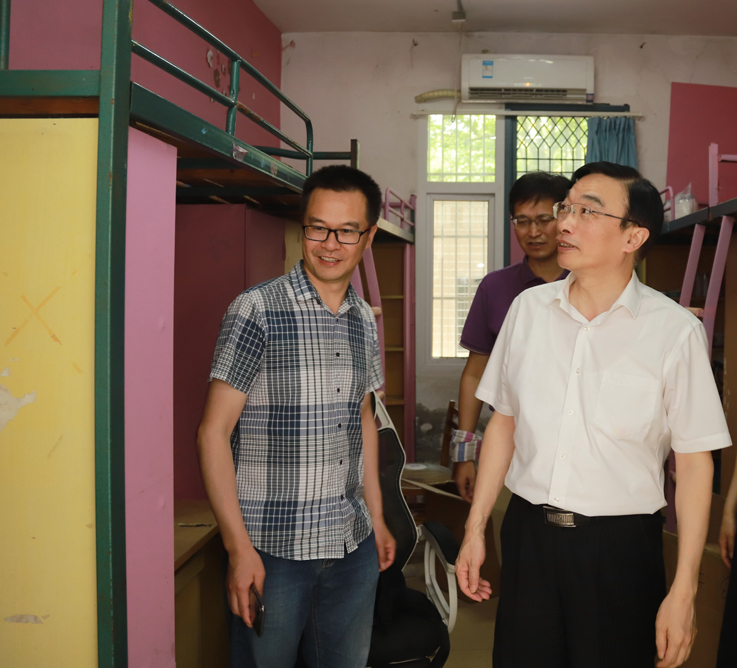 本网讯 6月30日,校党委书记、校长孙道胜,副校长丁克伟深入北校区学生宿舍,走访慰问搬迁学生。学工部、后勤集团、经济与管理学院负责人陪同。