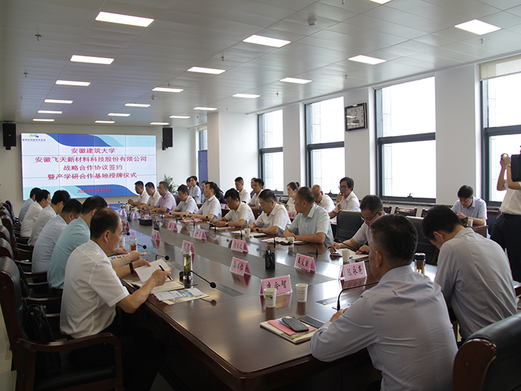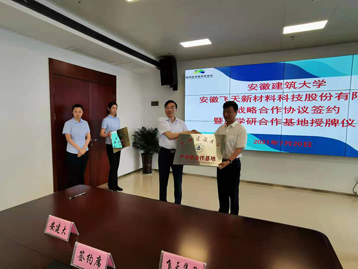 本网讯 7月20日,校党委书记、校长孙道胜率队赴安徽飞天新材料科技股份有限公司签订校企战略合作协议,并为安徽建筑大学和安徽飞天新材料科技股份有限公司产学研合作基地以及安徽省先进建筑材料重点实验室宿州分室授牌。副校长成祖德,宿州市人民政府党组成员、副市长张海虹出席签约和授牌仪式。