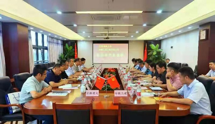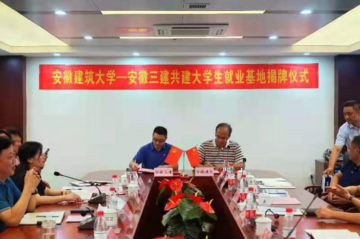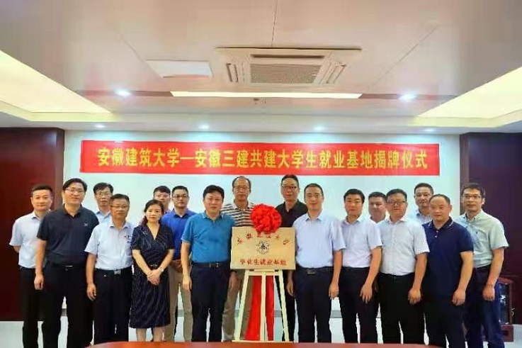 本网讯 8月13日,副校长闵杰率就业工作处、研究生院、土木学院、材化学院相关负责人赴安徽三建工程有限公司北城工业公司开展校企合作交流,并举行安徽建筑大学毕业生就业基地签约与揭牌仪式。安徽三建工程有限公司党委副书记、总经理何洪春,党委副书记、工会主席黄丽春,副总经理王兴明等公司领导参加。