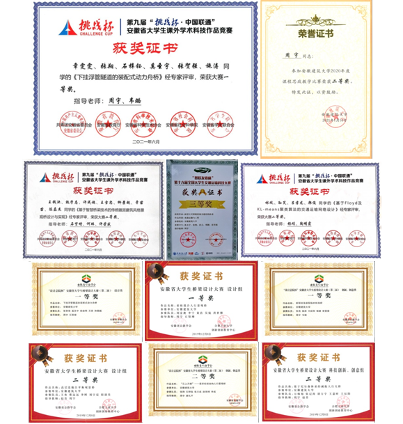 党支部重视提高理论课堂教育水平,紧抓实践课堂的教学质量,以“教之以事而喻诸德”理念提升育人效果,全面落实立德树人,不断深化课程思政建设。在专业理论课方面,《道路勘测设计》《路基路面工程》《桥梁工程》等被列为省级规划教材,《道路工程材料》被评选为精品线下开放课程,《桥梁工程检测与加固技术》获批课程思政试点课,支部组织委员、青年教师周宇荣获学校首届课程思政教学竞赛中获二等奖、线上教学比赛优秀奖。在实践课堂上,专业实践和学科竞赛等活动丰富着学生的学习生活,全面提升学生创新精神和实践能力。近三年,支部教师指导学生成功申报国家级、省级大学生创新创业训练计划项目50余项,近两年指导学生踊跃参加全国交通科技大赛、省大学生桥梁设计大赛、省交通科技大赛、省结构设计大赛等专业学科竞赛,荣获一等奖4项,二等奖8项,三等奖3项、“一带一路”建筑类大学国际联盟大学生结构设计大赛三等奖1项。值得一提的是,在2021年的第九届安徽省“挑战杯”决赛中,支部党员教师石贤增、陶明霞、周宇指导的作品斩获省一等奖1项,二等奖的2项的佳绩。