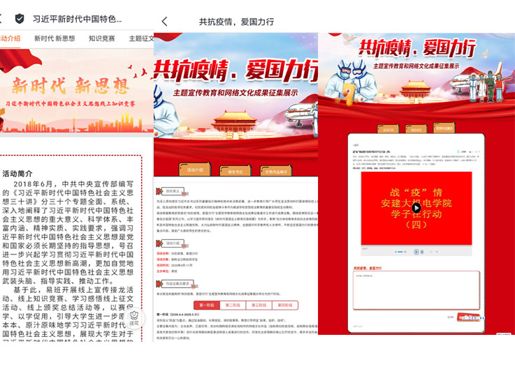 网络思政扎实推进。聚焦“搭建有情怀的平台 服务学生成长成才”,准确把握学生需求,积极回应学生关切,努力拓宽宣传途径,不断增强传播质量,着力搭建学校网络宣传思想文化的重要阵地。加强“融媒体+思政”建设,推进网络育人工作。加大网络育人载体建设,依托官网、QQ群、微信公众号、易班等网络阵地,推动网络媒体融合发展。从团队搭建到形象宣传,从建章立制到内容输出,从强化网络监管到规范舆情监督管理,不断推进微信公众号平台、易班制度化、规范化、标准化建设,把牢网络舆论宣传主阵地。突出价值引领,优化网络内容供给。“十三五”期间,利用网络平台推出了“普法小课堂”“党的十九大”“改革开放四十周年”“习近平新时代中国特色社会主义思想”“学风创建”“榜样示范”“共同战疫”等系列专栏;以学生喜闻乐见的方式开展了“我的大学我的梦”“毕业季”“‘九月初见·九月再见’疫情期间返校报到”“我和国旗同框,我与祖国同行”“同上一堂课·网上重走长征路暨‘四史’教育”直播学习等活动200余场次。通过丰富而不失趣味的活动,搭建内容共融、共通、共享的网络育人平台,唱响主旋律,传播正能量。