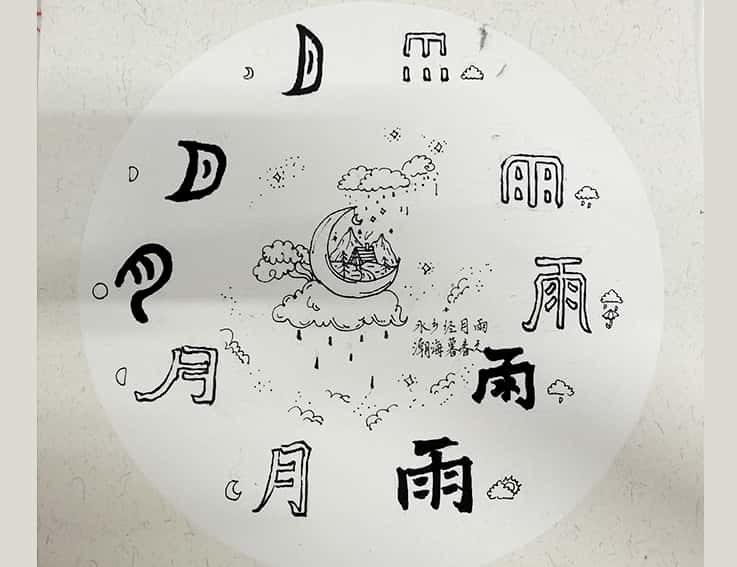 20级动画专业罗筱珂的作品《字》,选取了作者喜爱的诗人王之望的诗句“水乡经月雨,潮海暮春天”作为创作主题,以“月”和“雨”的文字演变来展现这一诗句,以字化形描绘思想,以艺述字传递文化。
