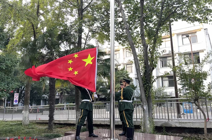 迎着初升的朝阳,国旗仪仗队迈着整齐划一的步伐,护送国旗至升旗台前。伴随着雄壮的国歌,在全体师生的注目礼下,五星红旗在晨曦中冉冉升起。与国旗一同升起的,还有师生们投身强国伟业,奋进新征程,共筑中国梦的雄心壮志。