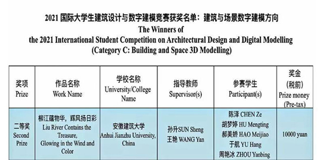 本网讯 10月11日,艺术学院学生团队创作的作品《柳江蕴物华,徽风扬日彩》荣获2021年国际大学生建筑设计与数学建模竞赛建筑与场景数字建模方向二等奖。