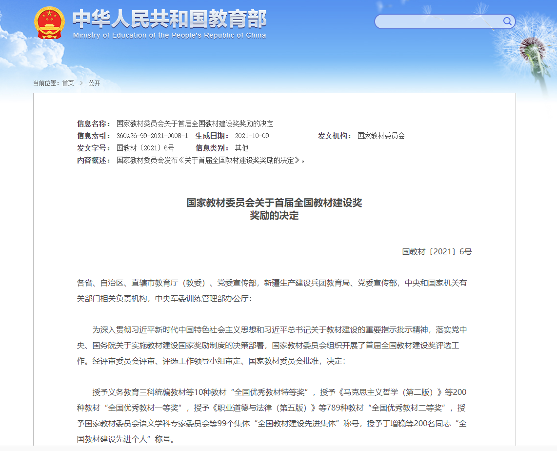 全国教材建设奖是新中国成立以来,我国首次设立的教材建设专门常设性奖项,是我国教材工作领域的最高奖项。该项荣誉的取得,是学校深入贯彻习近平总书记关于教材建设的重要指示批示精神的具体实践,是学校立足高质量发展阶段、积极建设高质量教育体系的成果检阅。