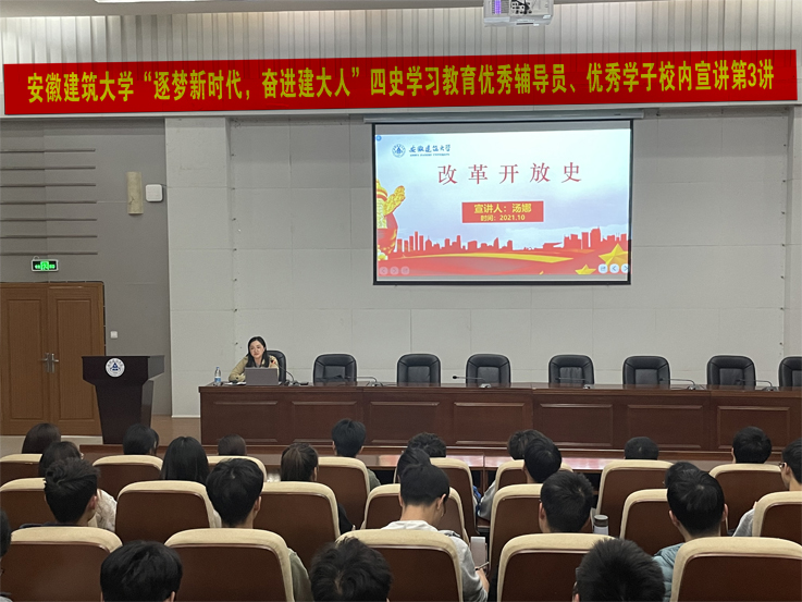 学工部副部长汤娜宣讲了“改革开放史”,她以问题为导向,强调当代大学生学习“四史”的重要意义,通过详实的数据和鲜明的案例阐述了为什么要进行改革开放、改革开放的业绩与成就和改革开放的未来思考,让同学们深刻了解了改革开放是一条正确之路、强国之路和富民之路,激励建大学子要自觉加强“四史”学习,并从中汲取营养和力量,不断解放思路、自我革命、锐意进取、砥砺奋进,在不懈奋斗中践行初心使命,在新征程中全力以赴再创辉煌。