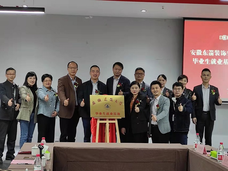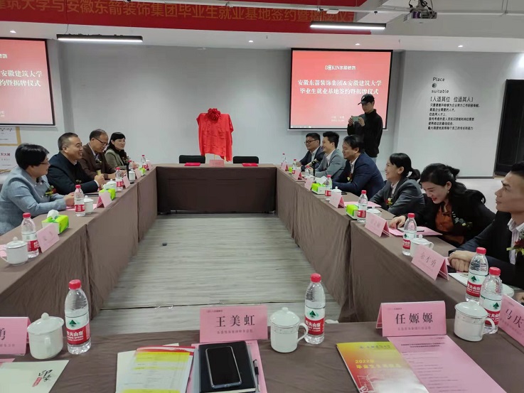 本网讯 为进一步拓宽毕业生就业渠道、提升学校毕业生就业质量,11月5日,副校长闵杰率就业工作处、艺术学院、公共管理学院相关负责人赴安徽东箭装饰设计工程有限公司开展校企合作交流,并举行安徽建筑大学毕业生就业基地签约与揭牌仪式。