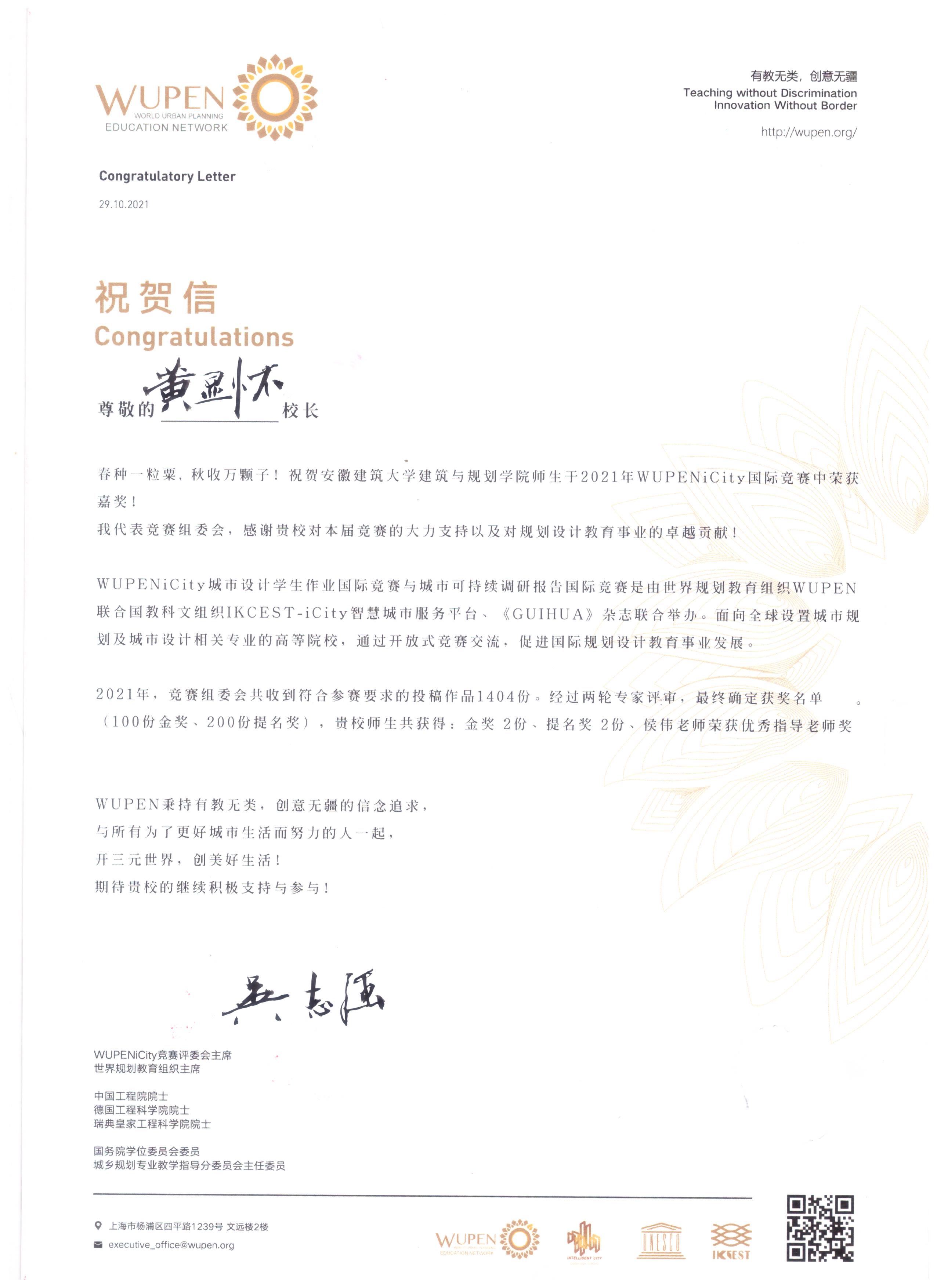 竞赛组委会予校长的贺信,不仅表达了对我院师生获奖情况的祝贺,还表达了对我院师生积极组织竞赛工作的肯定。多年来,规划系注重优良传统的传承,高度重视学生专业竞赛的组织工作,坚持走出去,敢于对标国内一流院校,以专业竞赛为重要引领,不断提升本科教学水平。(作者:白贤清 汪勇政;审核:王薇)