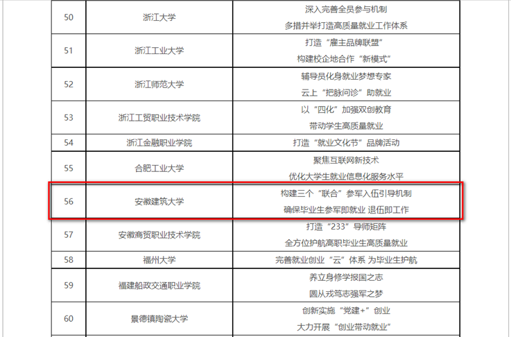 本网讯 11月26日,教育部公布全国普通高校毕业生就业创业工作典型案例名单,安徽建筑大学“构建三个‘联合”参军入伍引导机制,确保毕业生参军即就业退伍即工作”案例成功入选,为安徽建筑大学第二次党代会胜利召开献上一份厚礼。