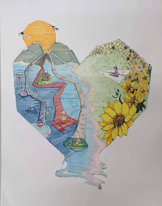 同学们紧扣活动主旨,创作了一系列温暖阳光的绘画作品。20级环境设计中外专业周雅静、汪思雨同学的作品《心若向阳,春暖花开》运用油画的画法,结合机绘的形式,表达新颖,画面柔和,如沐暖阳;19级视觉传达专业于紫悦同学的作品《童真》讲花与兔子组合,表达手法新颖,富有童趣;20级环境设计专业胡恩惠、张雨琳同学的作品《心路》将“心”的元素分为两边,寓意为“只要一心向阳终会春暖花开,人生路上的风景都是对我们最好的馈赠”。
