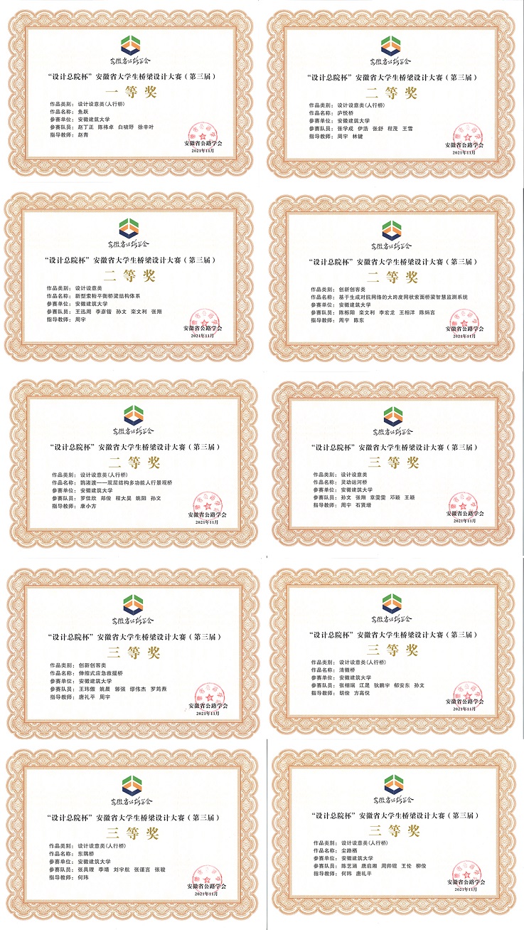 本次大赛以“创新、设意、精妙”为主题,分为“设计设意类”、“设计设意类(人行桥)”和“创新创客类”三个组别。其中,我校参赛作品《鱼跃》获得评委专家的高度评价并荣获“设计设意类(人行桥)”一等奖。《新型索桁平衡桥梁结构体系》、《庐悦桥》、《鹊渚渡--双层结构多功能人行景观桥》喜获“设计设意类(人行桥)”二等奖;《基于生成对抗网络的大跨度网状索面桥梁智慧监测系统》喜获“创新创客类”二等奖。《灵动运河桥》、《清徽桥》、《东隅桥》、《尘路栖》喜获“设计设意类(人行桥)”三等奖;《伸缩式应急救援桥》喜获“创新创客类”三等奖。我校参赛作品获得现场专家评委们的高度评价,为学校争得了荣誉。参赛同学们表示,在指导教师的悉心指导下,通过本次竞赛夯实了学科专业技能、提升了科技创新能力,获益匪浅。