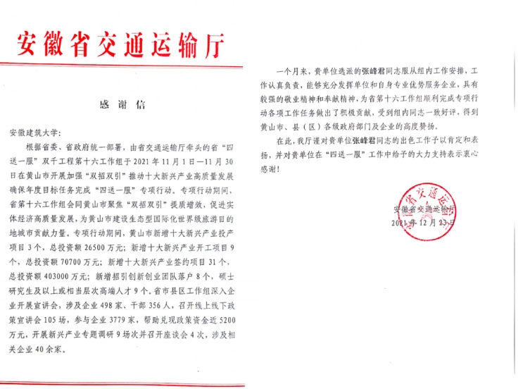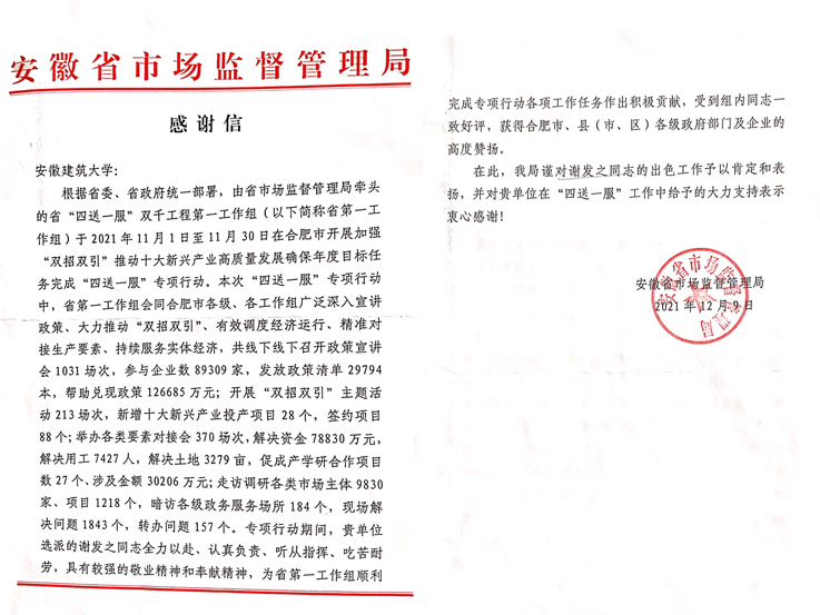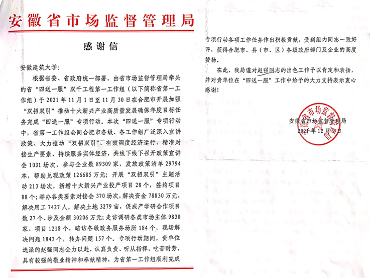 本网讯 近日,安徽省市场监督管理局、安徽省交通运输厅就我校“四送一服”双千工程工作发来感谢信,对我校给予省“四送一服”第一工作组、第十六工作组的支持表示感谢,对我校选派的谢发之、赵强、张峰君三位同志表示高度认可。他们全力以赴、认真负责、听从指挥、吃苦耐劳,具有较强的敬业精神和奉献精神,为省第一工作组、第十六工作组顺利完成专项行动各项工作任务做出积极贡献,受到组内同志一致好评,获得合肥市、县(市、区)各级政府部门及企业的高度赞扬,工作组为此向学校发来感谢信。
