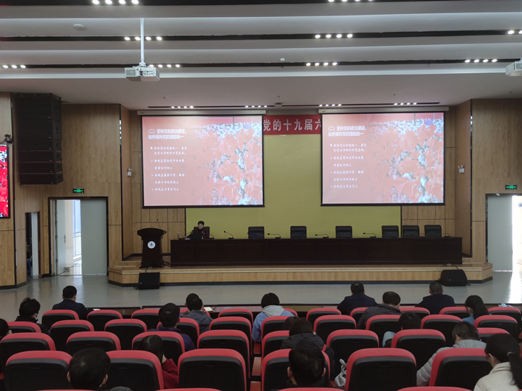12月23日,纪委书记王玉兰在实验综合楼二楼报告厅为数理学院、材化学院全体党员师生解读党的十九届六中全会精神,报告会由学院党委书记主持。