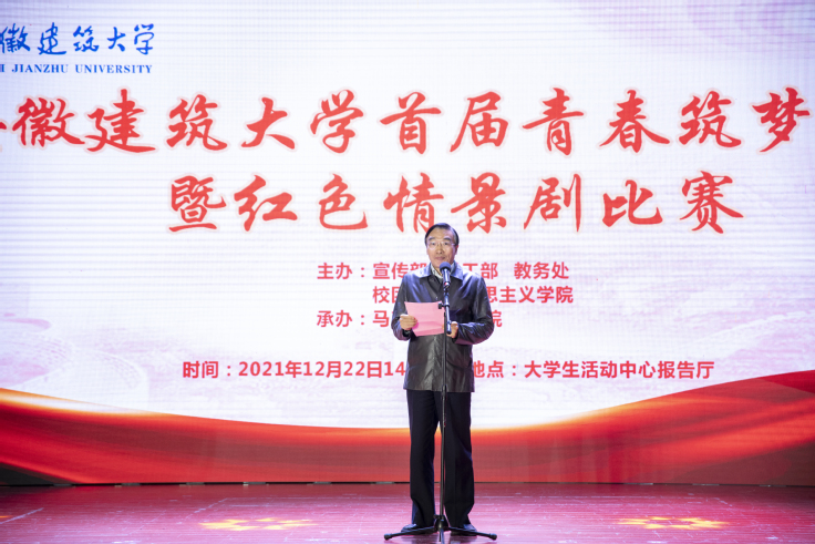 本网讯 12月22日,安徽建筑大学青春筑梦剧场暨红色情景剧决赛在大学生活动中心举行。比赛采取线上线下同步直播互动的方式开展。校党委书记孙道胜致开幕辞,安徽农业大学马克思主义学院院长黄洪雷、安徽医科大学马克思主义学院院长柳泽民、合肥师范学院马克思主义学院院长吕明、校学生处处长、校团委副书记应邀担任本次比赛评委。宣传部、学生处、教务处、团委以及马克思主义学院等部门负责人出席活动。本次活动由宣传部、学工部、教务处、校团委和马克思主义学院联合主办,马克思主义学院承办。