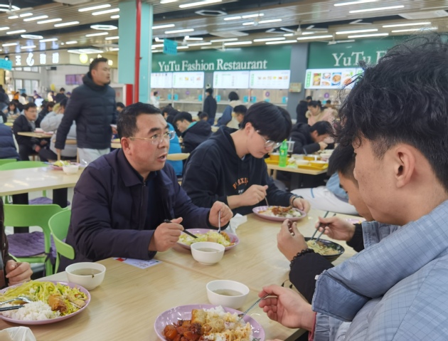 12月31日,辞旧迎新之际,蔡国军走进食堂,与同学们一起排队打饭,同桌就餐,边吃边聊。他关切地询问同学们的学习生活情况。同学们也少了往日的拘谨,各抒己见,畅所欲言,与校领导的交流中不仅谈饮食,谈住宿,还结合自己的专业学习向老师们话理想、说困惑、谈建议,蔡国军不时地对他们的关切问题进行一一解答。