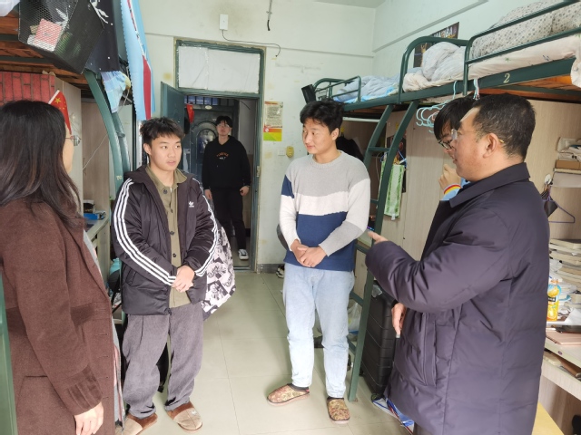 宿舍楼里,蔡国军在检查学生宿舍用电、用水、消防等方面安全隐患的同时,与学生“拉家常”,了解学生家庭情况,倾听学生在学校宿舍文化建设与日常管理方面的意见建议。蔡国军向同学们送去了新年的祝福,提醒同学要做好寝室卫生大扫除,要将寝室文化建设作为大学生活的重要部分,构建和谐、美丽、开放、共享的寝室文化环境,并以新的精神面貌迎接新年的到来。
