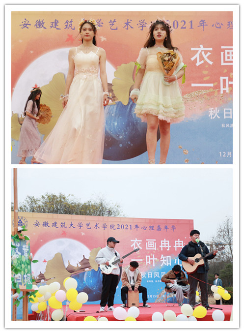 同学们通过具有专业特色的活动传递生活中的美好,展现青春风采,追逐梦想。艺术学院举办的“衣画冉冉,一叶知心”心理嘉年华秋日风采主题秀,依靠着自己的奇思妙想,制作了一件件别出心裁的落叶饰品与秋日羽衣,展示出艺术学院学生的想象力和动手能力,现场跳跃的音符演绎青春的活力,动人的舞步展示青春的风采,传递出对美好校园生活的热爱。