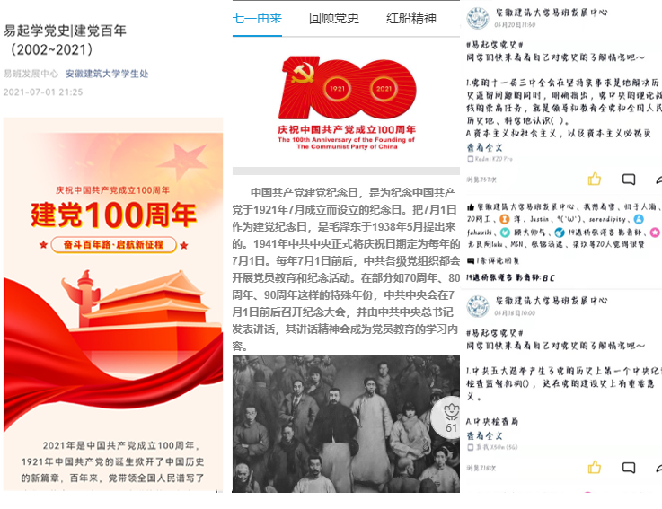 把牢阵地创新网络育人。立足思想教育工作和信息化手段有效结合,依托微信公众号、“易班·今日校园”平台,构建立体化网络育人矩阵,开展网络育人工作。2021年,通过微信公众号开设“易起学党史”“易建拾光”“小憩易刻”“疑问易答”“易起吃叭”“易师心语”等专题14个,组织开展“归来春半 不负韶华”校园摄影、“运动风采易起拍”校运动会风采展示、“南北校区搬迁能量券”评选等活动,发布推文298篇;通过易班开展“开学第一课”、“学党史、祭英烈”、“铭记历史 珍爱和平”、系列党史学习教育,举办“读红色经典 忆峥嵘岁月”征文比赛、“学史明志 励志成才”线上知识竞答和“2021 我想说给你听”新媒体作品征集活动,推荐的3件优秀作品荣获安徽省级比赛前10名,全年易班发布动态679篇、文章552篇,筑牢网络育人阵地、丰富育人内涵。