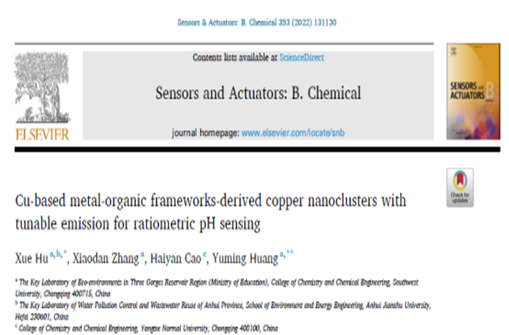 相关成果以“Cu-based metal-organic frameworks-derived copper nanoclusters with tunable emission for ratiometric pH sensing”为题发表在Sensors and Actuators: B Chemical(中科院一区期刊)上。第一作者为安徽建筑大学环境与能源工程学院胡雪老师。(文:胡雪;审核:谢发之)