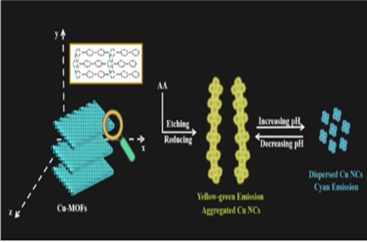 针对上述问题,环境与能源工程学院胡雪老师同西南大学黄玉明教授等人以具有良好晶型结构的铜基金属-金属有机框架(Cu-MOFs)为前体,通过刻蚀法制备荧光Cu NCs。通过该方法制备的Cu NCs呈现出独特的纳米线性结构,并具有结构和荧光可调控性。随着pH增加,Cu NCs的荧光蓝移,同时结构由线性转化为单分散颗粒。据此,该团队建立比率型荧光传感,应用于微生物的pH检测。该工作为Cu NCs的制备和荧光调控提供了新的有效途径,促进Cu NCs在更多领域的应用研究。