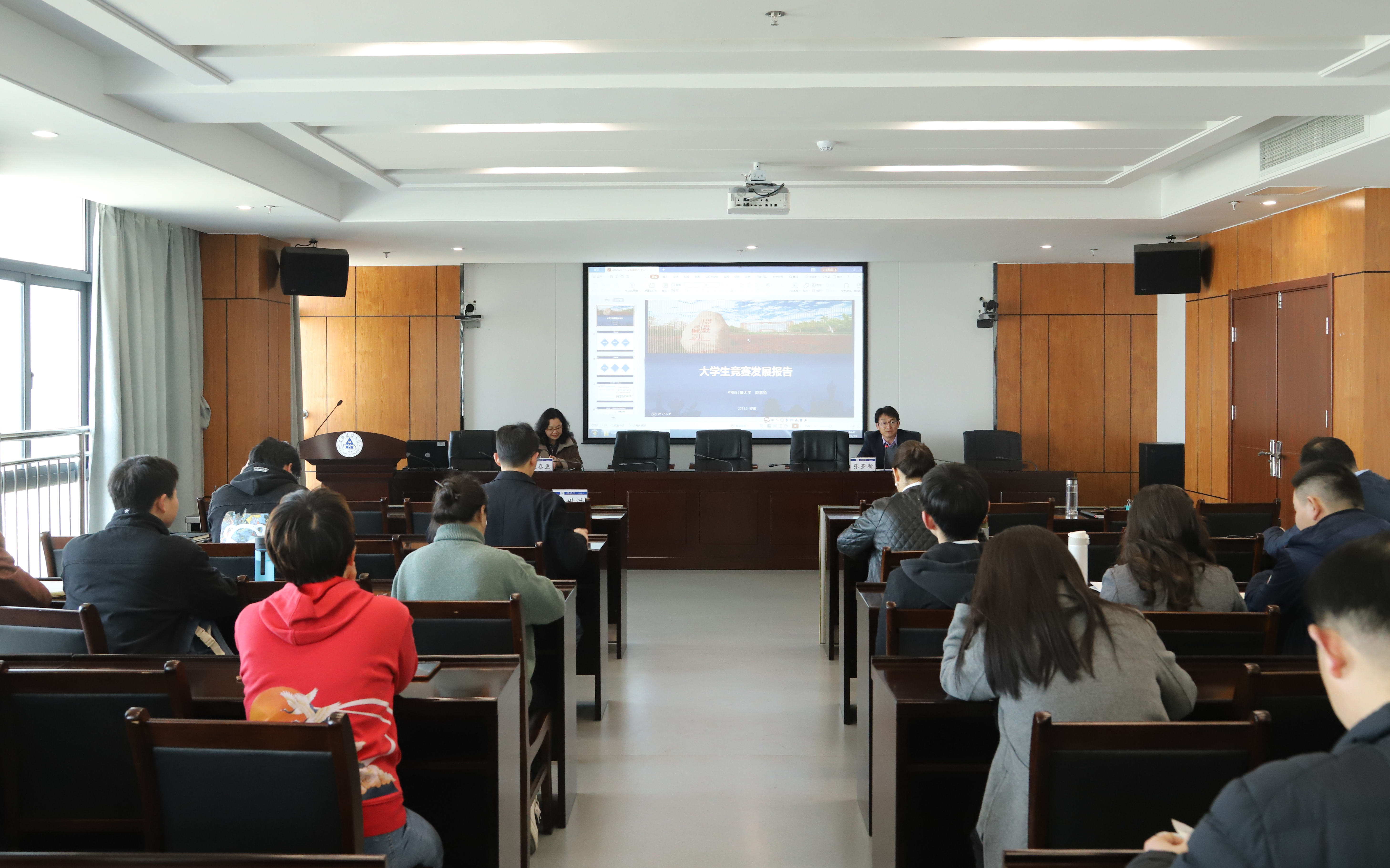 本网讯 3月4日,学校在南校区实验综合楼21楼第一会议室举办大学生学科竞赛专题报告会。全国高校竞赛评估与管理体系研究专家组成员、中国计量大学高等教育研究所副所长赵春鱼博士应邀做专题报告。学校各教学单位相关负责人及竞赛指导教师,教务处、就业工作处、校团委等部门负责人参会。报告会由校党委常委、副校长张亚新主持。