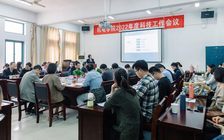 机电学院院长作学院2022年度科技工作报告,报告全面回顾了学院2021年度科技工作所取得的科研成果,结合近三年的业绩成果对比分析了存在的问题,并提出2022年的工作总体构想,着力从调动科研积极性,提升科研水平,促进科研平台产出和提高科研总量四个方面提出了具体举措和办法。