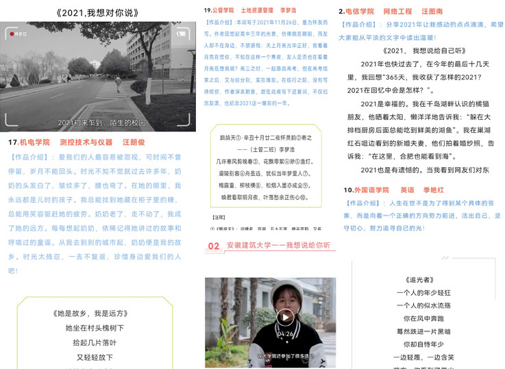 本网讯 近日,安徽省高校网络思想政治工作中心、安徽省易班发展中心公布了“2021,我想说给你听”新媒体作品征集活动比赛结果,在全省共13件获奖作品中,我校有3件作品获奖。其中,公共管理学院包思嘉同学的《致十八岁的自己》和电子与信息工程学院汪图南同学的《2021,我想说给自己听》获得“图文类作品优胜奖”,公共管理学院“公小影”团队创作的《我想说给你听》获得“视频类作品优胜奖”。