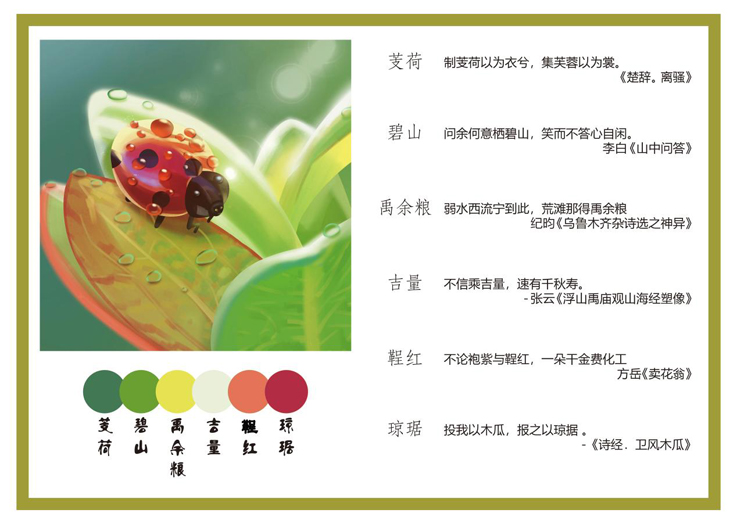 同学们创作热情高涨,运用“中国色”创作了一幅幅精美的作品。作品《春》采用芰荷、碧山、禹余粮、吉量、鞓红、琼琚六种生机勃勃的色彩搭配,展现出春日中鲜活灵动的一景。芰荷出自于《楚辞·离骚》,深绿的颜色体现出叶子的活力。碧山出自于李白的《山中问答》,翠绿色表现出叶子的稚嫩。禹余粮、吉量分别出自于纪昀的《乌鲁木齐杂诗选之神异》和张云的《浮山禹庙观山海经塑像》,而鞓红来于方岳的《卖花翁》,让七星瓢虫的颜色艳丽,形象活泼。最后一个颜色琼琚出自于《诗经·卫风木瓜》,六种风雅清新的“中国色”丰富了画面的构成层次感,同时也表达了古诗中的美妙意境。