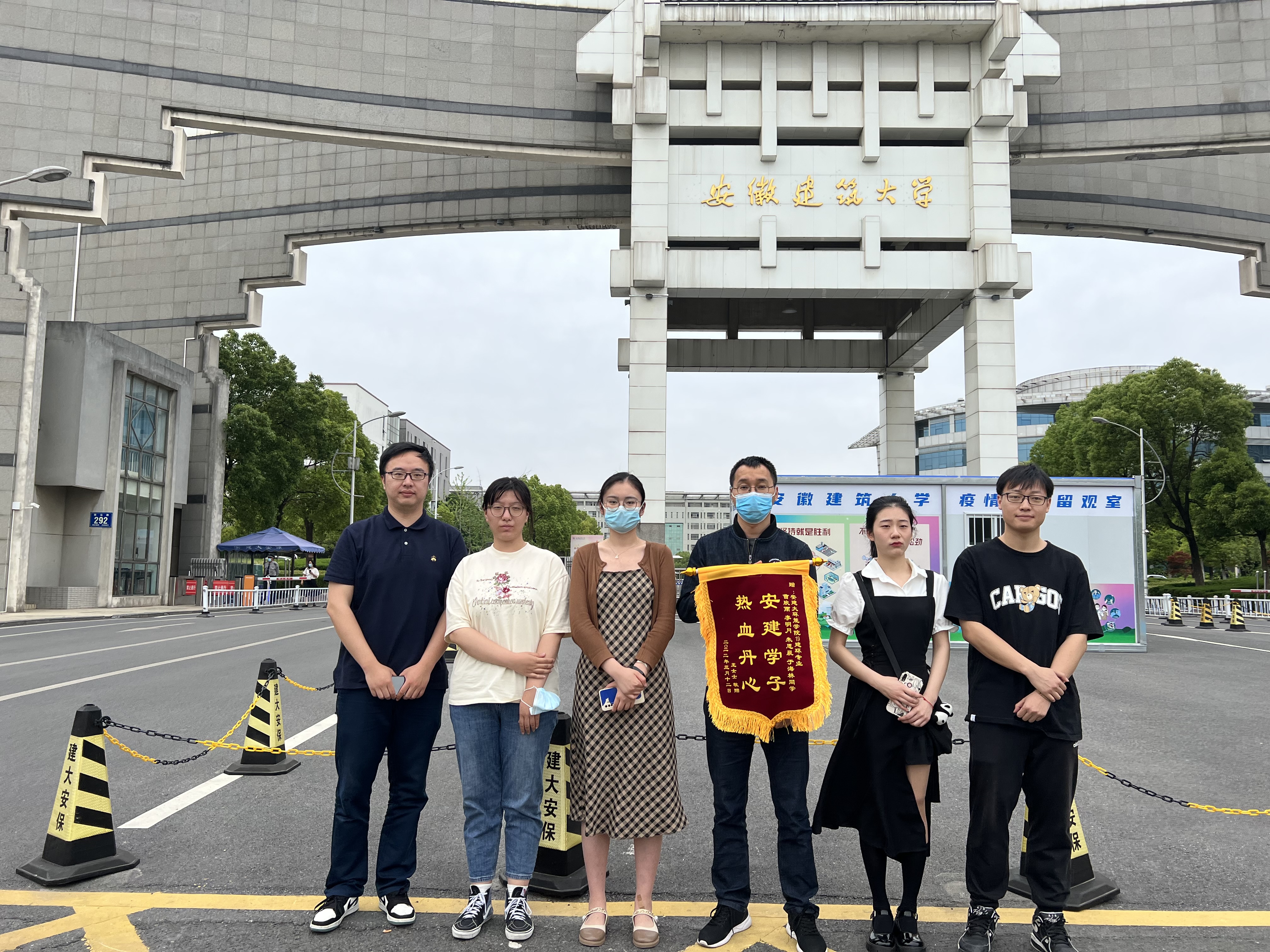 本网讯 “感谢安建大,感谢吴老师,感谢你们培养出这么善良的学生愿意在危急时刻献出鲜血!”5月18日下午,肥西县文旅局工作人员受白血病患儿菲菲家属的委托,手拿“安建学子、热血丹心”字样的锦旗,送到安徽建筑大学门口,向曾为菲菲生命接力献出鲜血的四名环能学院学生表示感谢。