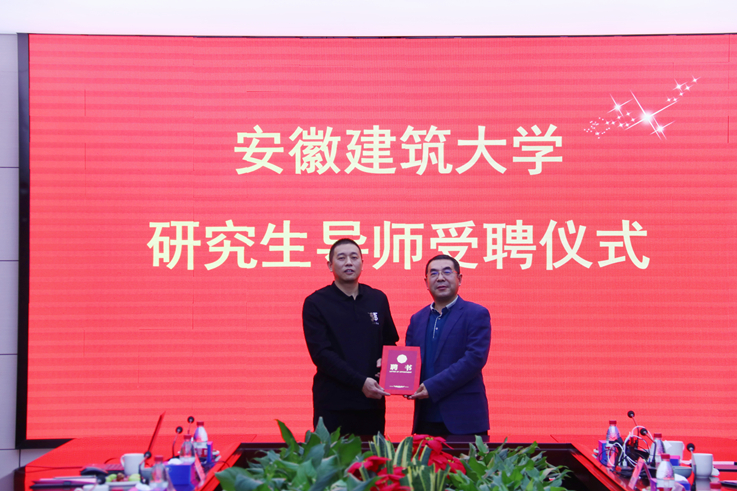 蔡国军对安徽苏亚建设集团有限公司及校友吴德雨总经理长期以来对学校建设和发展所给予的大力支持表示感谢,他从历史沿革、人才培养、办学成效等方面介绍了学校发展和取得成果,向吴德雨受聘校外导师表示祝贺,并为其颁发聘书。希望进一步增进科研合作、拓宽合作方式、深化合作力度。互惠双赢,资源共享,在校企合作方面取得更好成果。