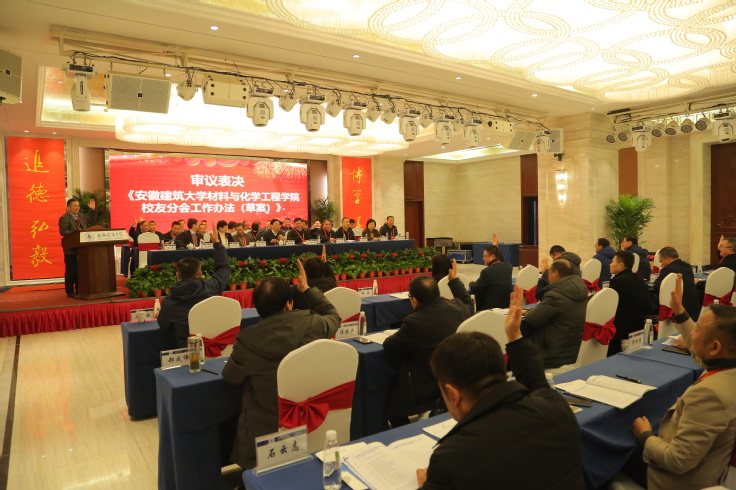接下来,材料与化学工程学院党委副书记何世明代表学院校友分会筹备工作领导小组从组织领导、校友联络和制度建设等方面向参会领导及嘉宾汇报了校友分会筹备工作情况。会议审议表决了《安徽建筑大学材料与化学工程学院校友分会工作办法(草案)》、《安徽建筑大学材料与化学工程学院校友分会第一届理事会理事、监事建议名单》和《安徽建筑大学材料与化学工程学院校友分会第一届理事会会长、副会长、监事长、秘书长建议名单》。经大会选举,万德军当选安徽建筑大学材料与化学工程学院校友分会第一届会长;丁益、徐明霞、吴斌、许强、李化建、陶龙忠、范磊、吴德雨、查甫生、余志刚、杨宋林、姚昌金、向学毅、石丙千等14人当选副会长;何世明、王锋当选秘书长;李志标当选监事长;大会选举106名校友代表任理事。