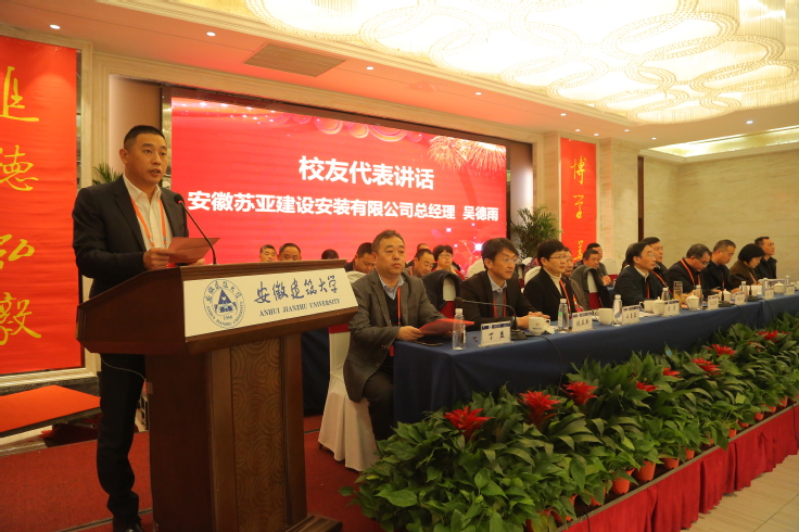 安徽苏亚建设安装有限公司总经理吴德雨作为校友代表进行发言,他深情回顾了在建大的求学经历,表达了对母校教育与培养深深的感激之情。他号召广大校友牢记母校教诲、拼搏进取,用青春和汗水建设伟大祖国,同时以校友会为依托,继续团结一心、共同努力,听从学院及母校召唤,尽己所能为建设国内一流、特色鲜明的高水平建筑大学努力奋斗!