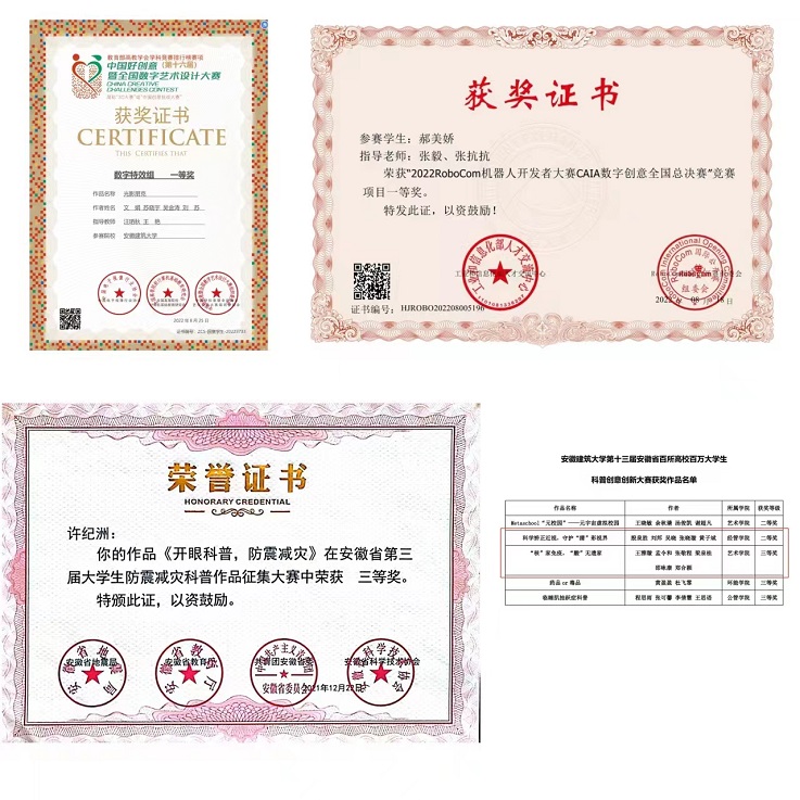 本网讯 为贯彻落实中共安徽省委教育工作领导小组《关于全面加强和改进新时代学校美育工作的若干措施》及《安徽建筑大学公共艺术教育俱乐部制实施方案》相关文件精神,校团委艺术指导中心全方位、多角度地开展美育工作,积极推动公共艺术教育俱乐部制改革。近日,俱乐部的成员们在安徽省教育厅、共青团安徽省委员会、安徽省科学技术协会等各单位组织的美育类活动中获得多项荣誉,他们满怀炽热的理想、澎湃的青春,与时代同向同行,与建大共同进步。