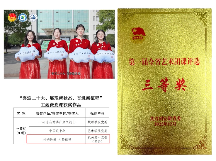 学校依托美育创新开展思政教育的全新理念,2022年艺术俱乐部同学们原创曲艺作品《打响快板,礼赞征程》在安徽建筑大学“喜迎二十大·展现新状态·奋进新征程”主题微党课活动中荣获一等奖;报送的系列文艺思政作品在安徽省“喜迎二十大,永远跟党走,奋进新征程”第一届艺术团课中获三等奖;创作录制“领学二十大·学习新思想”宣讲视频并在安徽学联微信公共号展播。