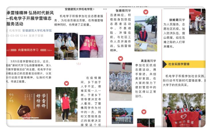 宣传积极正能量,用网络平台铸魂育人。学院易班开展“机电‘易’起做——雷锋品质共赓续”活动,邀请师生参与话题讨论,参加学雷锋志愿打卡活动,提倡用镜头记录身边学雷锋的好人好事。微信公众号开设“学习雷锋好榜样”专栏介绍身边雷锋人的先进个人事迹,树立可学可做、可追可及的道德标杆。19机电专业的张春杨同学说:“通过学院易班和公众号我发现原来身边有这么多的雷锋式人物。他们都激励我们要崇德向善、见贤思齐,自发加入学雷锋的时代方阵,自觉将雷锋精神转化为爱党爱国的奋斗动力,肩负起新时代赋予的青春使命。”