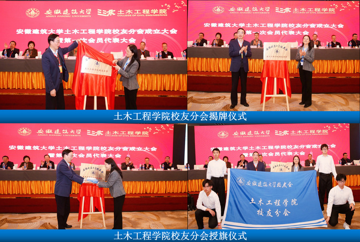 大会听取了《安徽建筑大学土木工程学院校友分会筹备工作报告》,审议通过了《安徽建筑大学土木工程学院校友分会工作办法(草案)》、《安徽建筑大学土木工程学院校友分会第一届理事会理事、监事建议名单》、《安徽建筑大学土木工程学院校友分会第一届理事会会长、副会长、秘书长建议名单》并举行了揭牌授旗仪式。