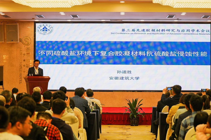 开幕式上,中国建筑学会建筑材料分会秘书长周永祥、湖南大学土木工程学院院长邓露、重庆大学材料科学与工程学院教授钱觉时和中国建筑材料联合会科技发展部副主任罗宁分别致辞。我校孙道胜教授以“不同硫酸盐环境下复合胶凝材料抗硫酸盐侵蚀性能”为题做了大会邀请报告,从硫酸盐浓度和环境pH对侵蚀机理的影响、不同浸泡方式下复合胶凝材料的抗硫酸盐侵蚀性能、不同侵蚀溶液下复合胶凝材料的抗硫酸盐侵蚀性能和改性钡盐对水泥混凝土抗侵蚀性能的影响四个方面介绍了团队关于现代混凝土耐久性—抗硫酸盐侵蚀性能的最新研究成果。