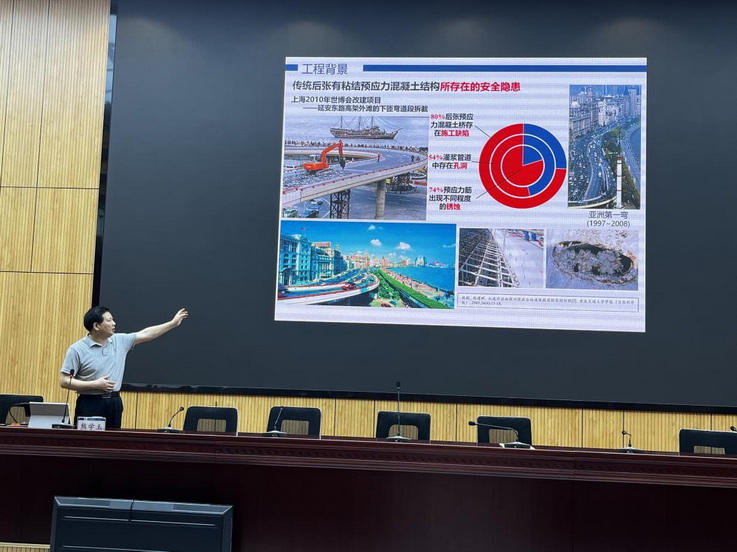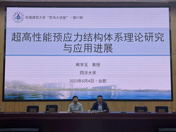 报告开始前,熊学玉教授对安徽建筑大学65周年校庆表示热烈祝贺并分享了自己在母校求学时的经历,对母校青年学子的学习与科研工作提出了宝贵意见。报告中,熊学玉教授首先联系实际工程分析了传统后张有粘结预应力混凝土结构所存在的安全隐患。随后介绍了自己团队在缓粘结预应力混凝土结构的精细化有限元模拟方法以及性能试验等方面的研究,并结合上海崇明花博会世纪馆项目、上海大歌剧院项目等阐述了超高性能预应力结构体系理论在重点工程中的应用。