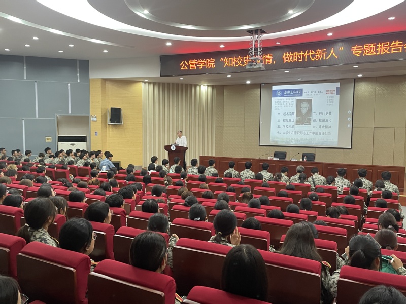 学校的历史是新生入学教育最生动、最有说服力的教科书。公管学院把校史校情教育作为新生入学教育切入点,9月26日,邀请校党委常委、宣传部部长徐庚阳以《知校史校情,做时代新人》为题作主题报告,从校名沿革、校门更替、校址变迁、校徽演化、学校发展和建大精神等方面进行讲解,开展校史校情教育。