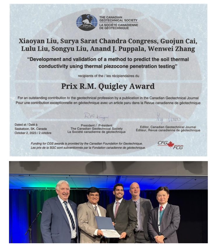 本网讯 近日,安徽建筑大学智能地下探测与工程地质原位测试团队发表论文“Development and validation of a method to predict the soil thermal conductivity using thermal piezocone penetration testing (T-CPTU) (doi:10.1139/cgj-2021-0034)”荣获2022年度《Canadian Geotechnical Journal》最佳论文奖,并被授予2023年“R.M.Quigley Award”。该论文第一作者为刘晓燕博士,通讯作者为蔡国军教授。2023年10月2日,论文共同作者德州农工大学Anand J. Puppala教授与密歇根州立大学Surya S. C. Congress助理教授参加了加拿大岩土工程学会年会GeoSaskatoon2023并接受颁奖。