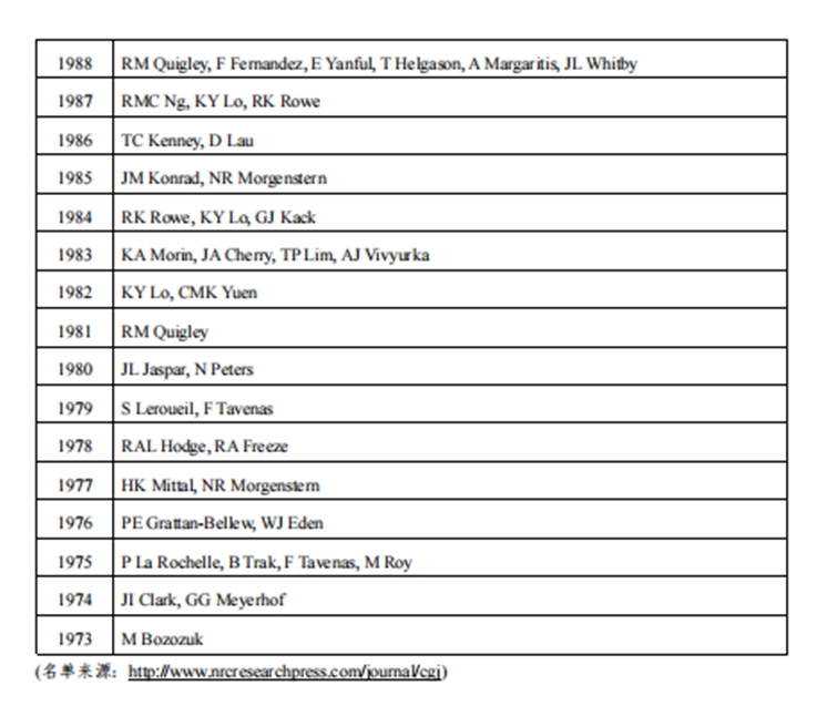 该奖设立于1973年,原名“加拿大岩土工程学会奖”,1995年更名为“R.M.Quigley Award”,以纪念R. M. Quigley博士(1934-1995)在岩土工程和地质环境领域做出的杰出贡献。该奖旨在表彰前一年度在《Canadian Geotechnical Journal》(国际三大权威岩土期刊之一)上发表的最佳论文(全球每年仅1篇)。(文/图:聂利青;审核:王媛)